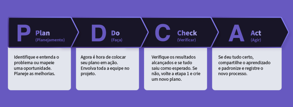 - PDCA (Plan-Do-Check-Act): Um ciclo que envolve planejar, executar, verificar e agir. Logo, é ideal para melhoria contínua.